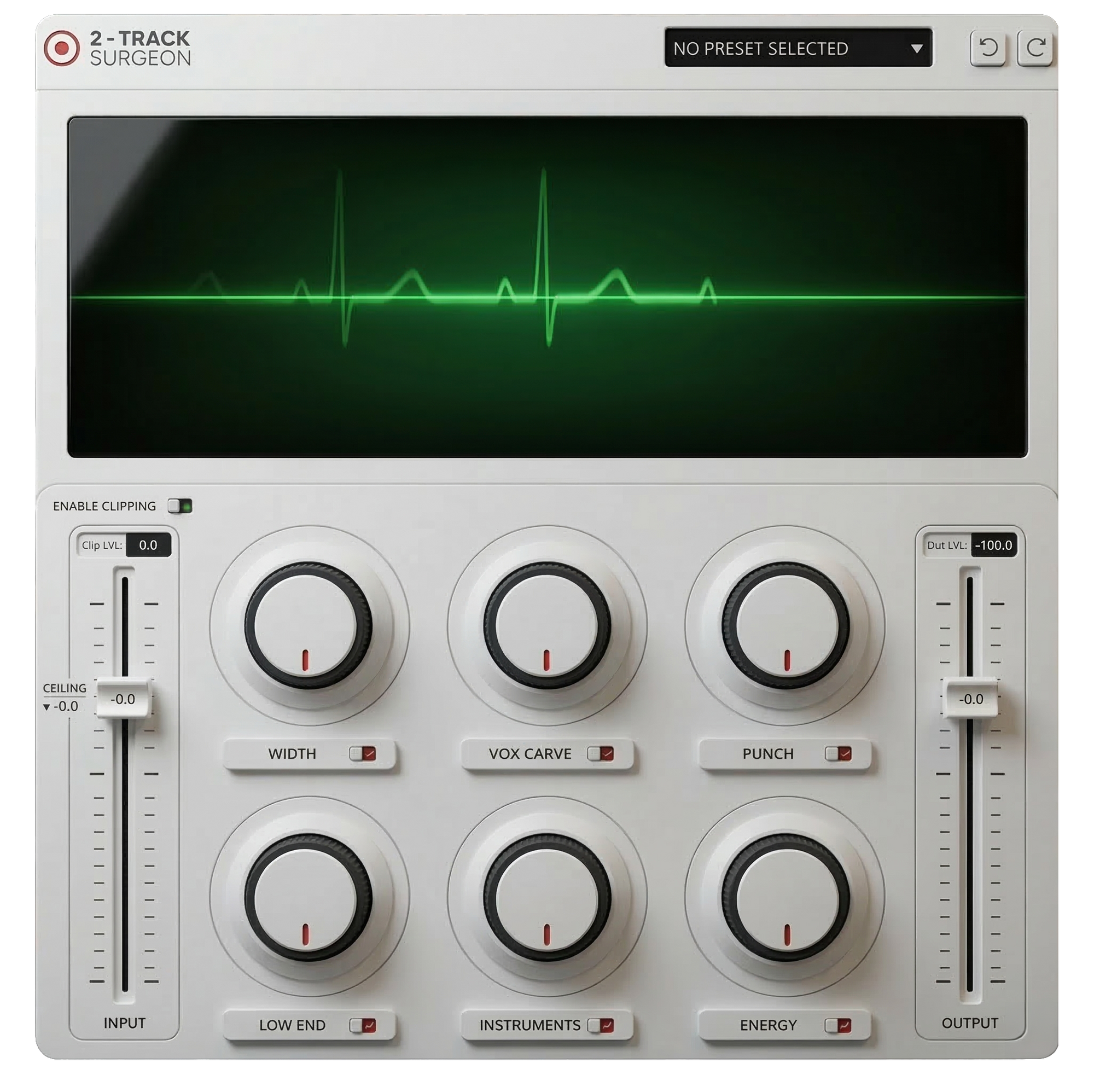 2-Track Surgeon helps you enhance width, tighten the low end, clear space for vocals, and bring energy back into your mix buss or 2 Track instrumental fast.